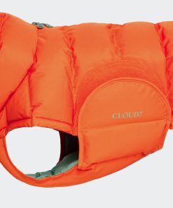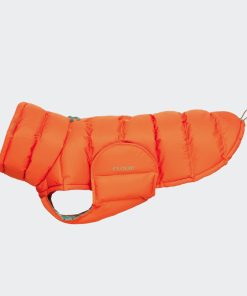 Veganer Hundemantel aus 100% nachhaltigen Materialien. Die extra warme Winter Hundejacke in Burnt Orange mit kontrastfarbigen Details ist anstelle von Daunen mit Eco Puffer aus recycelten PET-Flaschen gefüttert.